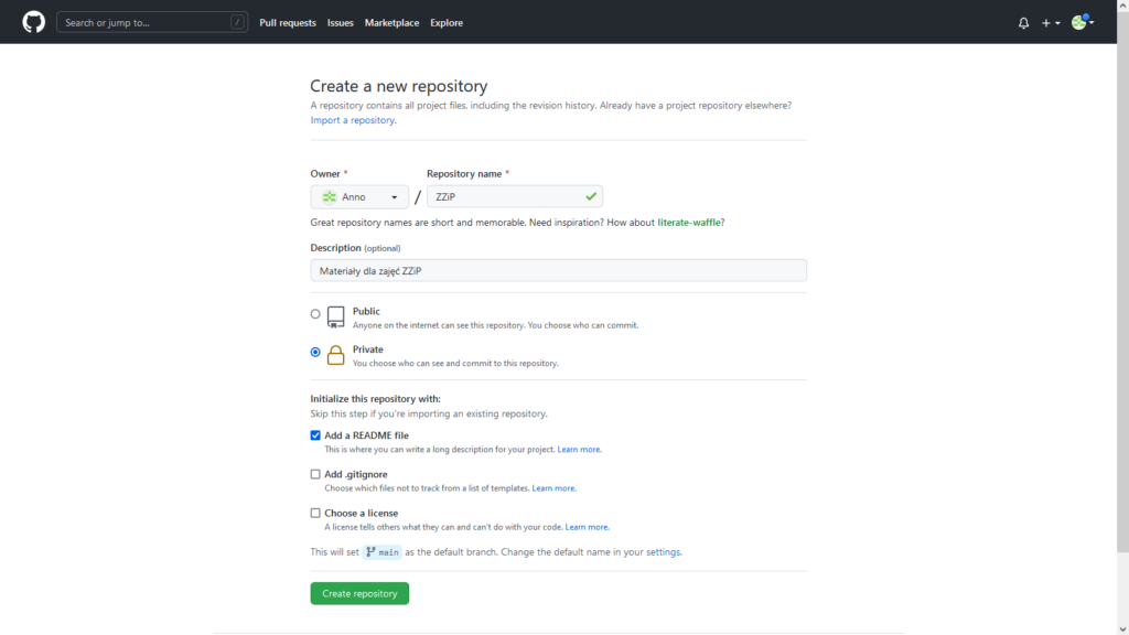 W tym momencie możemy zadecydować o konfiguracji tego repozytorium i wybrać jego parametry: