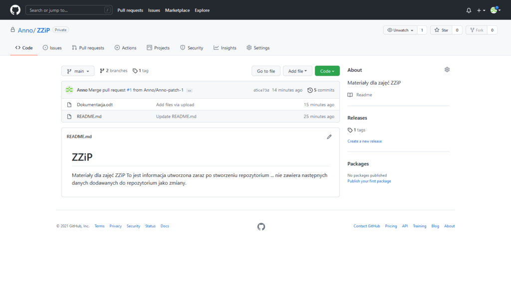 To co nam ukazuje się następnie okienko naszego projektu, gdzie możemy rozpocząć wgrywanie plików 1 Możliwe jest rozpoczęcie pracy bezpośrednio w Git na własnym komputerze w wybranym katalogu, gdzie automatycznie treści będą przenoszone do GitHub’a, ale to temat na odrębne zajęcia.