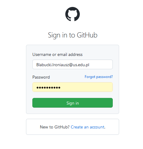 Git współpracuje z macierzystym dla niego systemem repozytorium GitHub. Aby skorzystać z niego trzeba utworzyć konto i się zalogować do przydzielonego repozytorium.