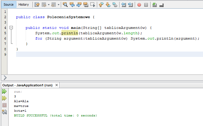 Użycie tego w programie jest już banalnie proste. Pewnie zauważyliście konstrukcję metody main, gdzie w jej argumentach jest umieszczona tablica Stringów?! Jeśli tak, to możecie się już domyślić, że w tej tablicy umieszczone są wszystkie argumenty podane w linii uruchomienia naszego programu rozdzielone delimiterem w postaci spacji ” „. Przykład takiego programu sprawdzającego argumenty z linii poleceń i jego działania jest umieszczony poniżej: