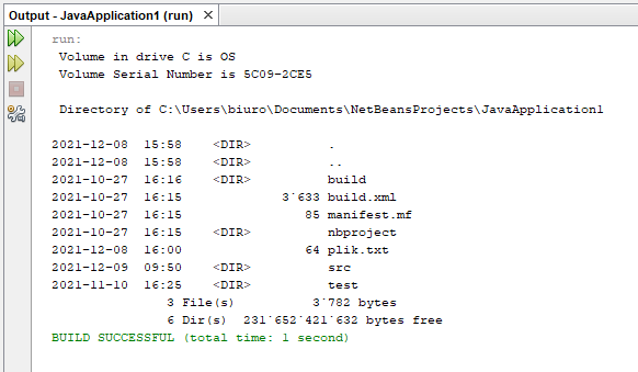 Często także potrzeba sprawdzić jakie pliki istnieją w bieżącym katalogu roboczym np. w celu wybrania jednego z nich do odczytu. Można skorzystać z metody .list() klasy File aby zbudować tablicę Stringów zawierającą nazwy plików.