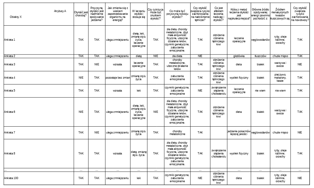 - skończony zbiór obiektów X i skończony zbiór atrybutów A .
