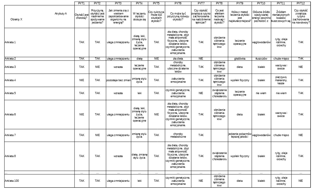 gdzie gdzie ∃! VPYT3 = „ulega zmniejszeniu” ⊕ „pozostaje bez zmian” ⊕ „wzrasta”; - VPYT4 = { „dietę”, „leki”, „zmianę stylu życia”, „leczenie operacyjne” };
