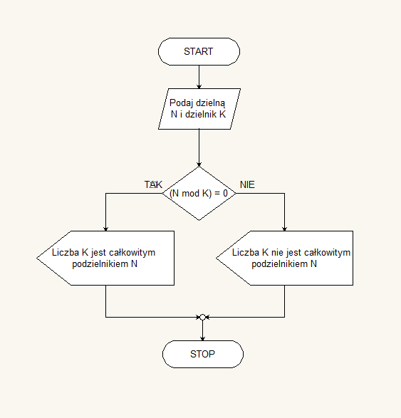Mamy stworzyć algorytm pobierający od użytkownika dwie liczby, a następnie testujący, czy pierwsza z liczb jest całkowicie podzielna przez drugą. Taki algorytm jest w miarę prosty do stworzenia poprzez analogię do już znanego algorytmu sprawdzającego czy liczba jest parzystą. Można założyć, że jeśli mamy operację dzielenia całkowitego, to istnieje też operacja określająca resztę z dzielenia. Taką operacją matematyczną jest mod. Tak więc: