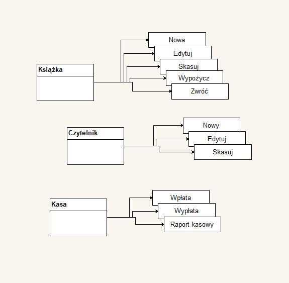 Temat Biblioteki to zgodnie z naszym wyobrażeniem projekcja miejsca w którym przechowywane są książki, na różnych półkach, w różnych kategoriach. Książki, które trzeba przyjąć, skatalogować, umieścić w odpowiedniej kategorii. Książki, które można wypożyczyć i zwrócić. Książki, które trzeba skasować z uwagi na ich zniszczenie. Książki, które są dostępne tylko w czytelni. Skoro książki to i czytelnicy, którzy mogą je wypożyczać, zwracać. Skoro czytelnicy to i czas na jaki mogą zabrać książki ze sobą i koszty jakie ponoszą związane z ich przetrzymaniem.