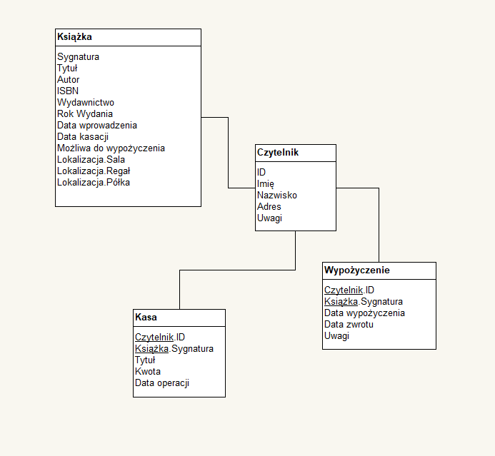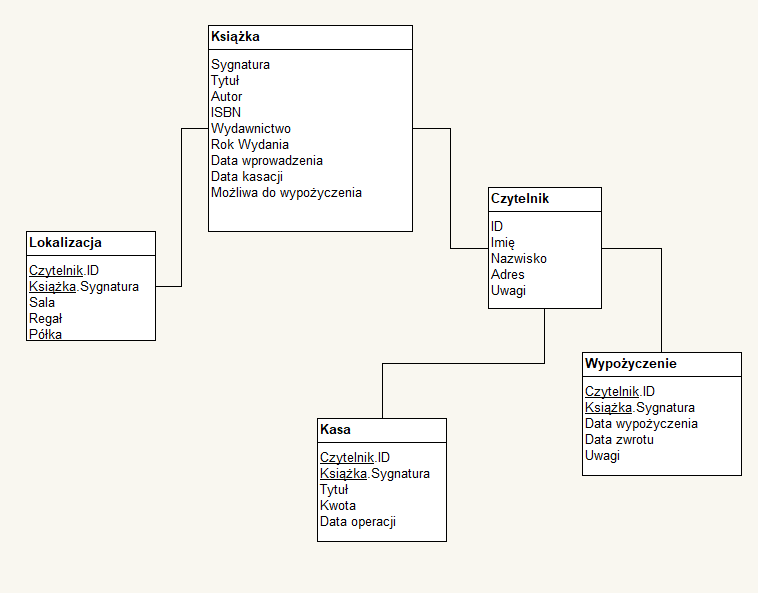 Analizując taki schemat można wychwycić błędy w naszym rozumowaniu i uprościć schemat, co oczywiście przeniesie się na uproszczenie struktur tworzonego oprogramowania. Także i tutaj można zauważyć, że „nasz” pomysł z tworzeniem oddzielnego bloku Lokalizacja jest w zasadzie zbędny. Odnosi się on do informacji o chwilowej lokalizacji książki w fizycznym środowisku, tak więc oddzielanie tego od opisu książki może być niepotrzebne (chyba, że chcemy rejestrować wszystkie zmiany lokalizacji książki w jej „życiu” w systemie bibliotecznym). Można więc nasz schemat uprościć do następującego:
