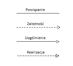 Przypadki użycia (oraz aktorzy) powiązane są ze sobą relacjami (związkami) określanymi w czterech kategoriach.
