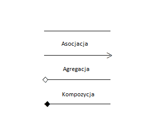 Instancje jednej klasy (oznaczone czarnym rombem) składają się z instancji drugiej klasy.