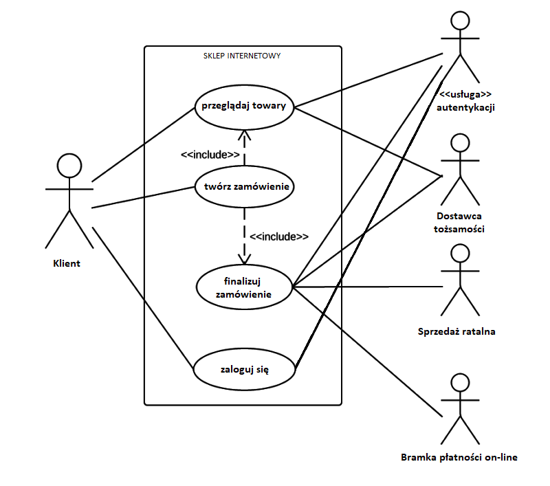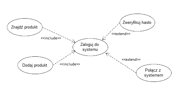 tylko wtedy. Jest przydatna gdy kilka przypadków użycia zawiera tę sama wspólną część. Strzałka skierowana jest od przypadku zawierającego do zawieranego.