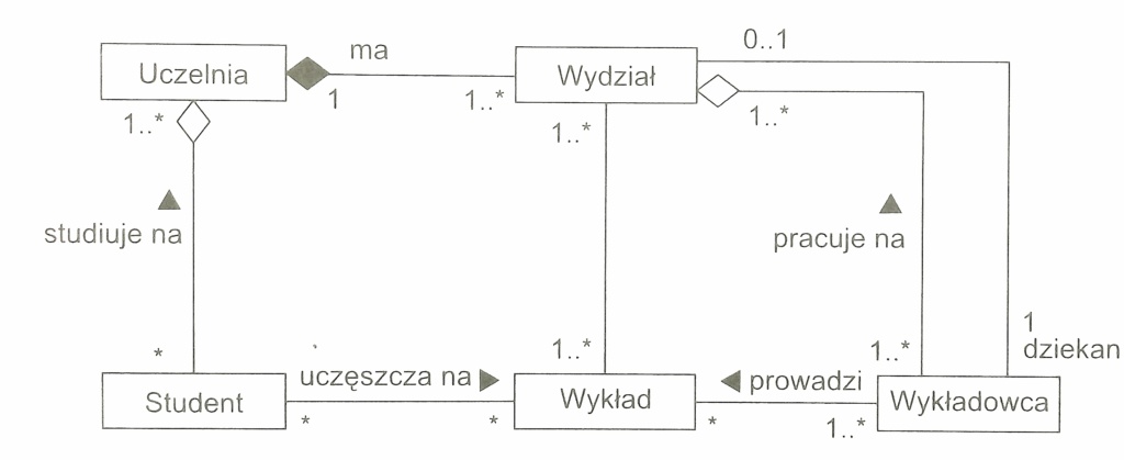 Instancje jednej klasy (oznaczone rombem) grupują instancje drugiej klasy np. Przedsiębiorstwo agreguje swój Dział.