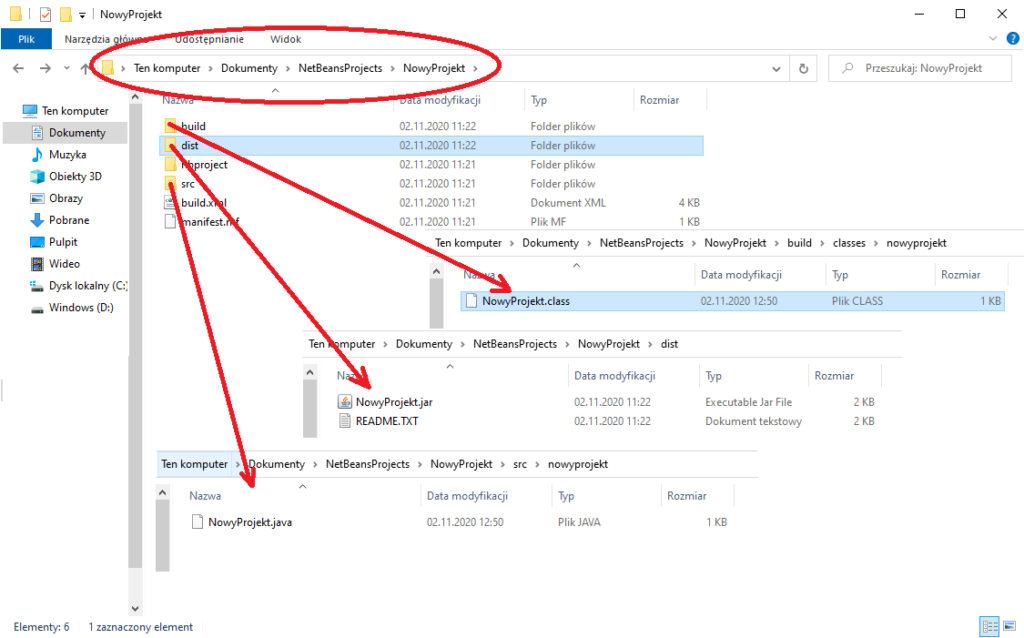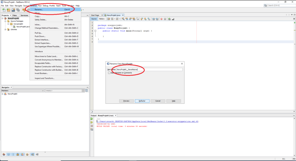 Zadanie do samodzielnego opracowania: Zapoznać się ze środowiskiem programistycznym NetBeans. Stworzyć pierwszy program. Skompilować go i odszukać skompilowany plik w katalogu projektu, a następnie spróbować go uruchomić bezpośrednio spod kontroli systemu operacyjnego Windows. Uruchomić program w ramach środowiska programistycznego (IDE). Zrefaktorować jego nazwę i po ponownym skompilowaniu sprawdzić skutek działania w katalogach projektu.
