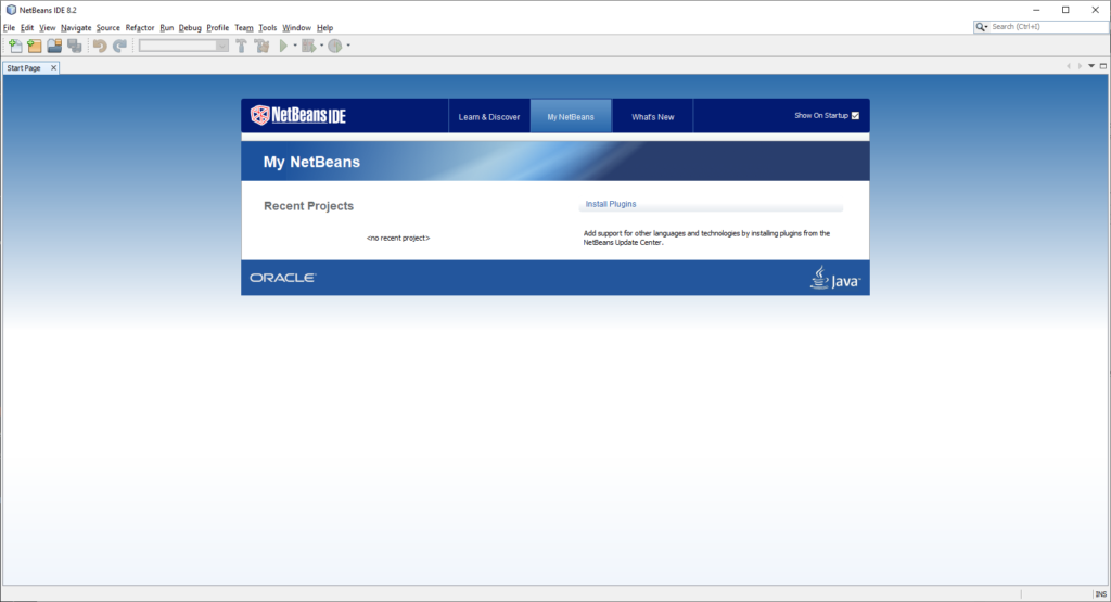 Środowiskiem programistycznym jest wspomniany już wcześniej NetBeans IDE w wersji 8.2. Po jego pobraniu ze strony oracle.com lub z działu Pobierz niniejszej strony i zainstalowaniu (koniecznie z Java Development Kit czyli z jdk) możemy przystąpić do uruchomienia i stworzenia pierwszego programu.