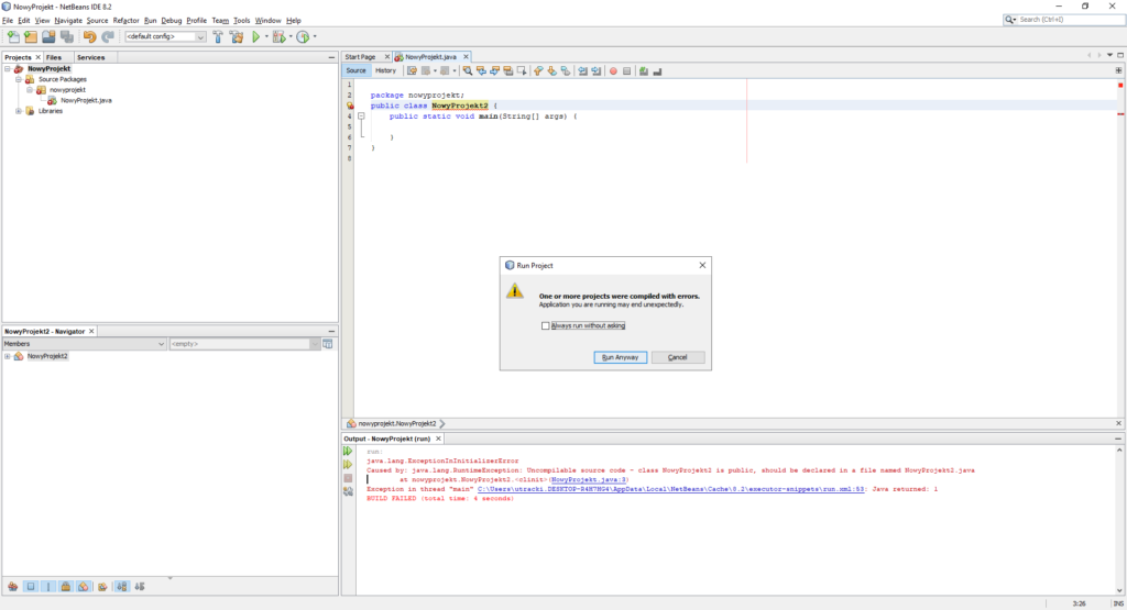 Niedotrzymanie powyższego wymogu i np. zmiana nazwy klasy wewnątrz kodu programu będzie skutkować niemożnością uruchomienia programu i wygenerowaniem informacji o błędzie. Koniecznym jest dostosowanie do nowej nazwy klasy także i nazwy pliku.