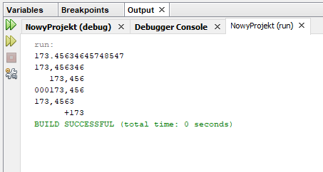 - formatowanie do lewej na 10 znakach, 3 cyfry po przecinku,