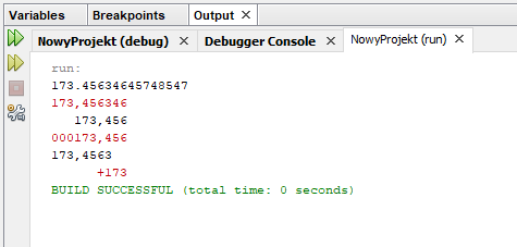 - brak formatowania, wyświetlenie liczby jako double (porównaj wartość przypisaną do zmiennej i wyświetloną),