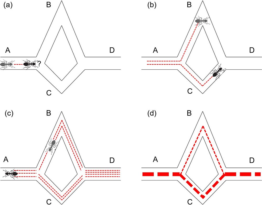 Na powyższym rysunku widać 4 etapy drogi Agentów, gdzie na ćwiartce (d) widać, że droga A-C-D jest najczęściej wybierana, bo czasowo (tu: kryterium decyzyjne) Agenty pokonują ją najszybciej, więc większa ich ilość pokonała właśnie tę drogę i oznakowała ją dzięki temu wyraźniejszym śladem (w Systemach Mrowiskowych mówi się o śladzie feromonowym).