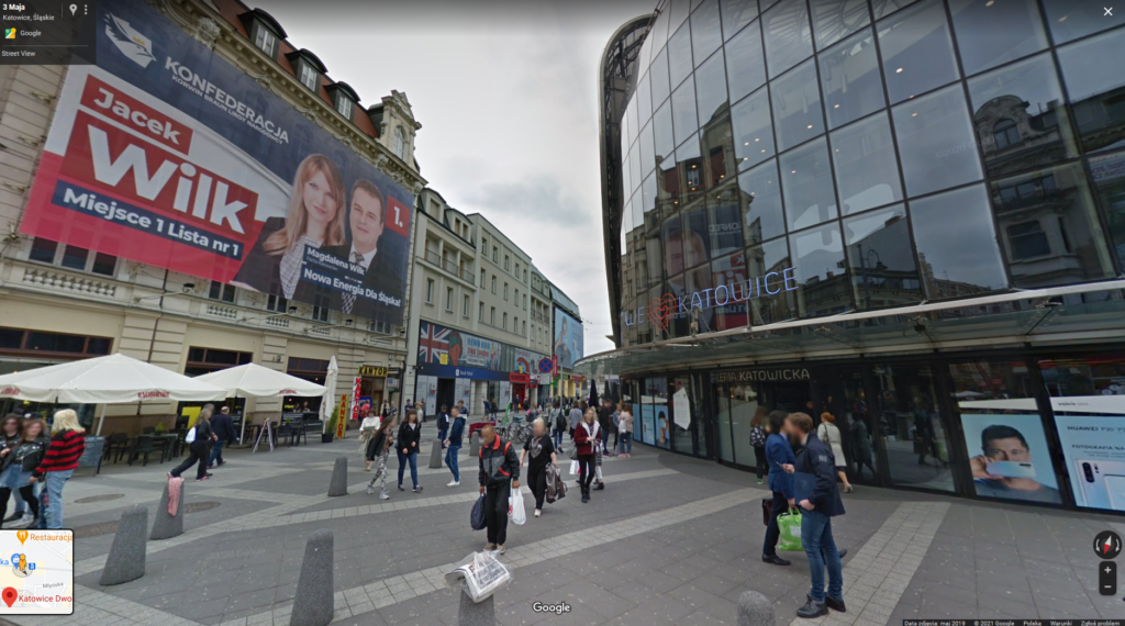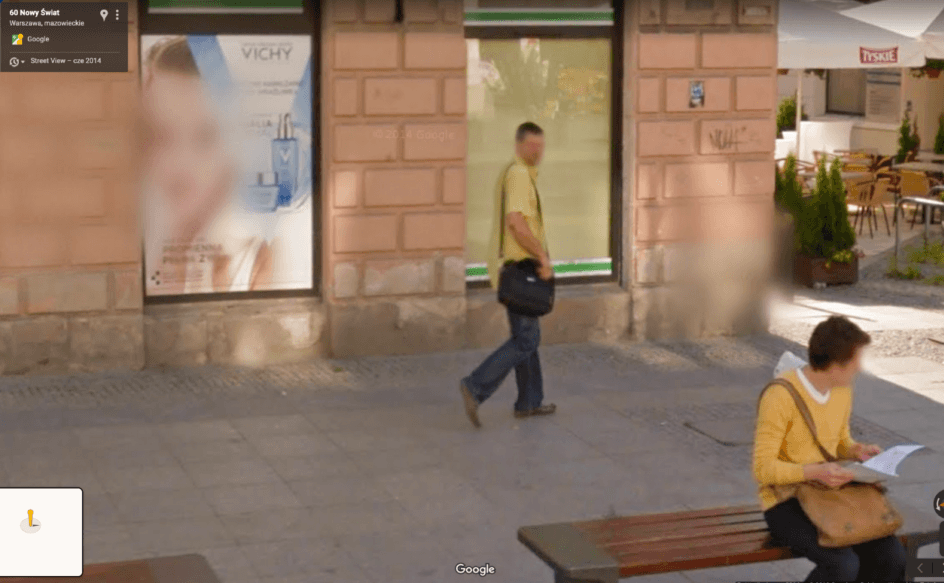 Poniżej widać trzy zdjęcia z GSV z jednej z warszawskich ulic. Ponieważ w większości krajów dane osobowe są chronione, twarze ludzi są rozmyte, by nie można było ich rozpoznać. Jak to działa? Komputer „widzi” twarz, więc automatycznie ją zamazuje. Ale jeszcze niedawno… komputer zamazywał także zdjęcia twarzy na reklamach i plakatach. Nie musi tego robić, bo osoba, która jest na plakacie wyraziła zgodę na pokazywanie swojego wizerunku. Gdyby zakrywaniem twarzy zajmował się człowiek, pominąłby reklamy, bo nie ma potrzeby ich ukrywania. Maszyna tego nie wie, dla niej twarz to twarz.