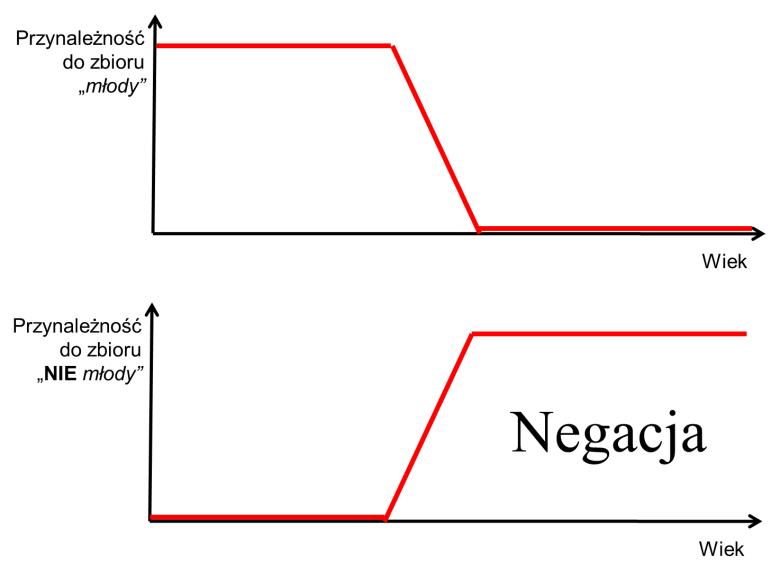 Tak słabo zatruta kawa chyba mi nie zaszkodzi. W końcu co chwilę słyszę, że dodatki do wędlin są szkodliwe, że używanie cukru jest szkodliwe, że powinienem wyrzec się alkoholu – a ja sobie pozwalam na różne rzeczy, i jednak żyję. A ponadto nie wiadomo dokładnie ile tej trucizny jest – może znacznie mniej niż 1%? Zaryzykuję, bo ta kawa bardzo mnie kusi!Jak widać, niepewność rozumiana jako stopień prawdopodobieństwa i niepewność wyrażana stopniem rozmycia są czymś odmiennym i mają odmienny wpływ na nasze działania. I świetnie, że dzięki zbiorom rozmytym mamy możliwość uwzględnić te oba rodzaje niepewności w systemach komputerowych (które z rachunku prawdopodobieństwa korzystały „od zawsze”), bo dzięki temu systemy te mogą lepiej odwzorowywać skomplikowaną rzeczywistość, w której nic nigdy nie jest do końca pewne, a każda obserwacja, pomiar lub opinia może być niedokładna lub nieostra.Użycie zbiorów rozmytych w sztucznej inteligencji jest dodatkowo korzystne dzięki temu, że opracowano dla nich specjalne reguły tak zwanej logiki rozmytej. W zwykłej logice używa się podstawowo trzech operatorów: negacji, alternatywy i koniunkcji. Operują one na wartościach logicznych prawda i fałsz, zapisywanych zwykle matematycznie jako 1 albo 0, co można traktować jako wartości funkcji przynależności do zbioru stwierdzeń prawdziwych.Wprowadzenie zbiorów rozmytych pozwala pewne stwierdzenia traktować jako nie całkiem prawdziwe albo częściowo fałszywe – co zbliża te modele rozumowania do sytuacji rzeczywistych, w których często o prawdziwości lub fałszywości pewnych stwierdzeń można mówić jedynie w przybliżeniu. Świat nie jest czarno-biały!Operatorem odpowiadającym negacji jakiegoś stwierdzenia jest w logice rozmytej branie funkcji przynależności obliczanej jako 100% minus wartość funkcji przynależności negowanego stwierdzenia. Popatrzmy na rysunek poniżej: Pokazano na nim (u góry) funkcję przynależności dla rozmytego zbioru odpowiadającego pojęciu „młody”, oraz u dołu negację tej funkcji przynależności, wyznaczającą rozmyty zbiór „NIE młody”.