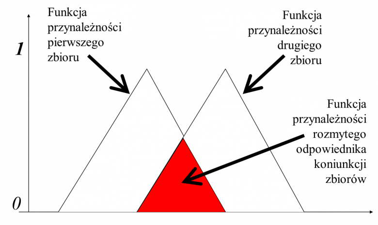Łatwo się przekonać, że dla zbiorów o ostro zarysowanych granicach (nie rozmytych) podana reguła jest identyczna z odpowiednią regułą logiki klasycznej .Ostatnią funkcja logiczną, do której się tu odwołamy, jest koniunkcja. W tradycyjnej logice koniunkcję buduje się używając spójnika „i”, na przykład „A i B”. Koniunkcja jest bardzo wymagająca: na to, żeby całe zdanie było prawdziwe konieczne jest, żeby prawdziwe były zarówno A jak i B. Muszą być prawdziwe razem, co powoduje, że koniunkcja bardzo często rozstrzyga negatywnie o prawdziwości zdania złożonego.Odpowiednikiem koniunkcji w logice rozmytej jest tzw. t-norma, której najprostszą formą jest minimum. Do zdania złożonego „A i B„, gdzie A i B są zbiorami rozmytymi, przypisujemy w każdym punkcie mniejszą z dwóch wartości funkcji przynależności odpowiednio dla zbiorów A i B. Ilustruje to rysunek: