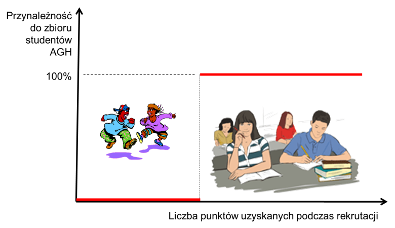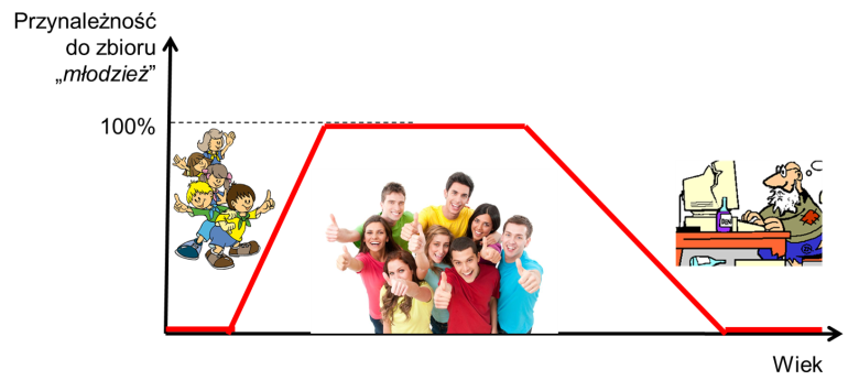 Osoby które uzyskały w trakcie rekrutacji więcej punktów od założonego progu – studentami są. Osoby, które otrzymały punktów mniej (albo wcale nie starały się o przyjęcie na studia, co odpowiada zerowej liczbie uzyskanych punktów) – studentami nie są. I nie ma tu żadnych niejasności.Natomiast jeśli wrócimy do nieostrego pojęcia „młodzież”, to niewątpliwie o przynależności do tego zbioru decyduje wiek. Jednak odpowiednią funkcję przynależności można narysować w taki sposób: