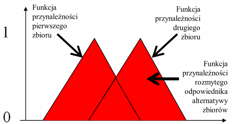 Innym operatorem logicznym używanym w tradycyjnej logice jest alternatywa. Operator ten powoduje, że zdanie złożone „A lub B” jest (jako całość) prawdziwe, jeśli przynajmniej jedno ze stwierdzeń składowych A lub B jest prawdziwe. Korzystając z alternatywy, można stosunkowo łatwo osiągnąć prawdziwość wyniku końcowego, bo tyko sytuacja, gdy A i B są równocześnie fałszywe daje w efekcie fałsz całości.Jeśli A i B są zbiorami rozmytymi, to odpowiednikiem alternatywy jest tak zwana s-norma, której najprostsza realizacja polega na braniu pod uwagę większej z tych dwóch składowych funkcji przynależności. Ilustruje to rysunek: