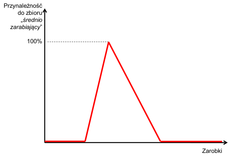 Widać, że człowiek stopniowo wchodzi w obszar wiekowy, w którym już nie jest dzieckiem i zaczyna być zaliczany do młodzieży, a potem również stopniowo wychodzi z wieku młodzieńczego w kierunku dojrzałości i docelowo starości. Funkcja przynależności na obu krańcach rozważanego przedziału wieku zmienia się stopniowo, najpierw od 0 do 100%, a potem od 100% do 0. W związku z tym określona osoba może być zaliczana do młodzieży w pewnym stopniu – na przykład w 70% albo tylko w 10%. Daje to pożądaną elastyczność w podejmowaniu decyzji w takich granicznych przypadkach.Kształt funkcji przynależności dla zbiorów rozmytych jest zwykle przyjmowany arbitralnie – na przykład w formie trójkąta, jak na rysunku poniżej pokazującym rozmyty zbiór „pracownicy średnio zarabiający”: