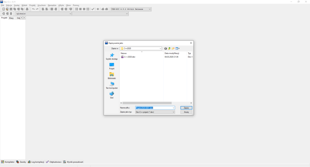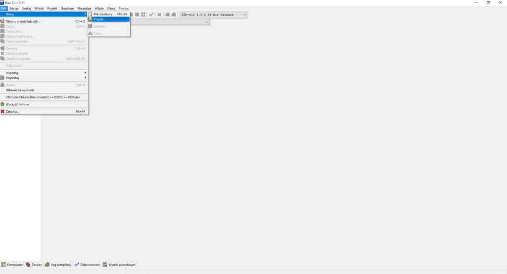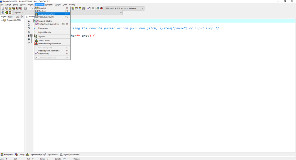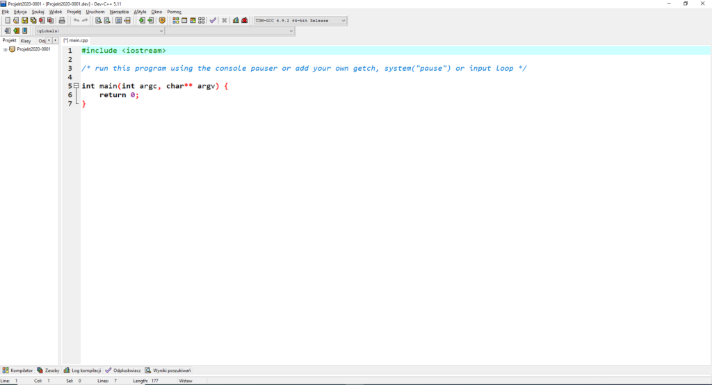 Program aby działał musi spełniać niezbędne kryteria poprawności syntaktycznej (składniowej) i semantycznej (znaczeniowej). Po uruchomieniu Środowiska Programistycznego Dev-C++ pojawia się ekran na którym możemy rozpocząć pracę z nowym projektem.
