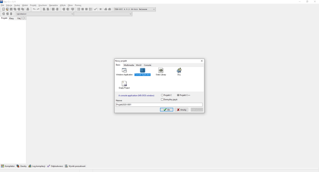 Po wybraniu opcji Plik>>Nowy>>Projekt wybieramy w okienku Console Application a w polu Nazwa: ustawiamy nazwę naszego projektu. Musimy pamiętać, aby nazwa nie zawierała polskich liter bo możemy się spotkać z nieoczekiwanym działaniem środowiska w późniejszym czasie.