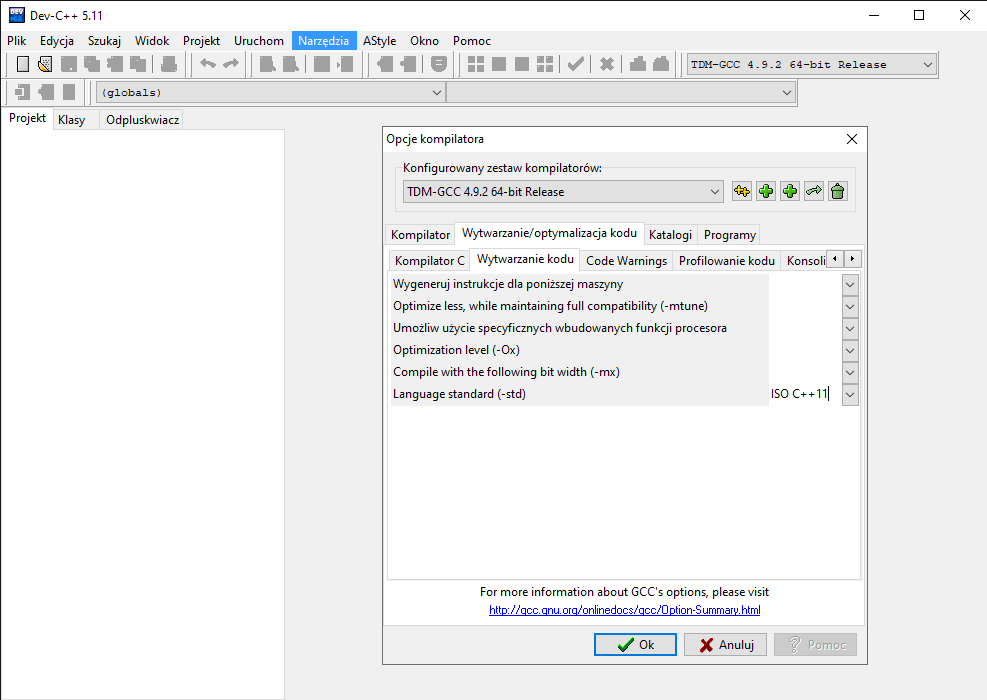 Drugą zmianą jest ustawienie wytwarzania kodu zgodnie ze standardem ISO C++11.
