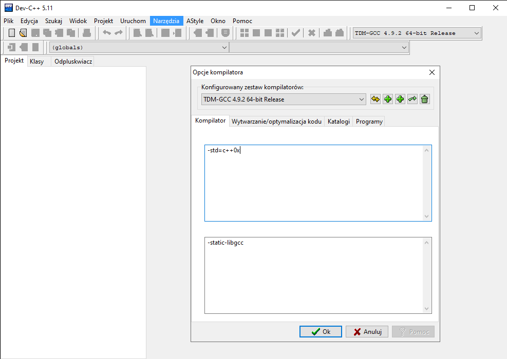 Zanim jeszcze przystąpimy do naszego pierwszego projektu i napiszemy pierwszy program upewnijmy się, że nasze środowisko programistyczne jest skonfigurowane należycie do tego, co zamierzamy w nim robić. Tak więc należy sprawdzić i ewentualnie uzupełnić konfigurację kompilatora tak aby zawierała funkcję generowania kodu -std=c++0x.