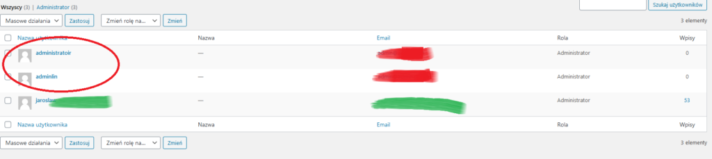 Ponadto okazało się, że do systemu CMS WordPressa zostały dodane następujące osoby jako administratorzy (tylko ostatni jest prawidłowy, legalny i poprawny!):